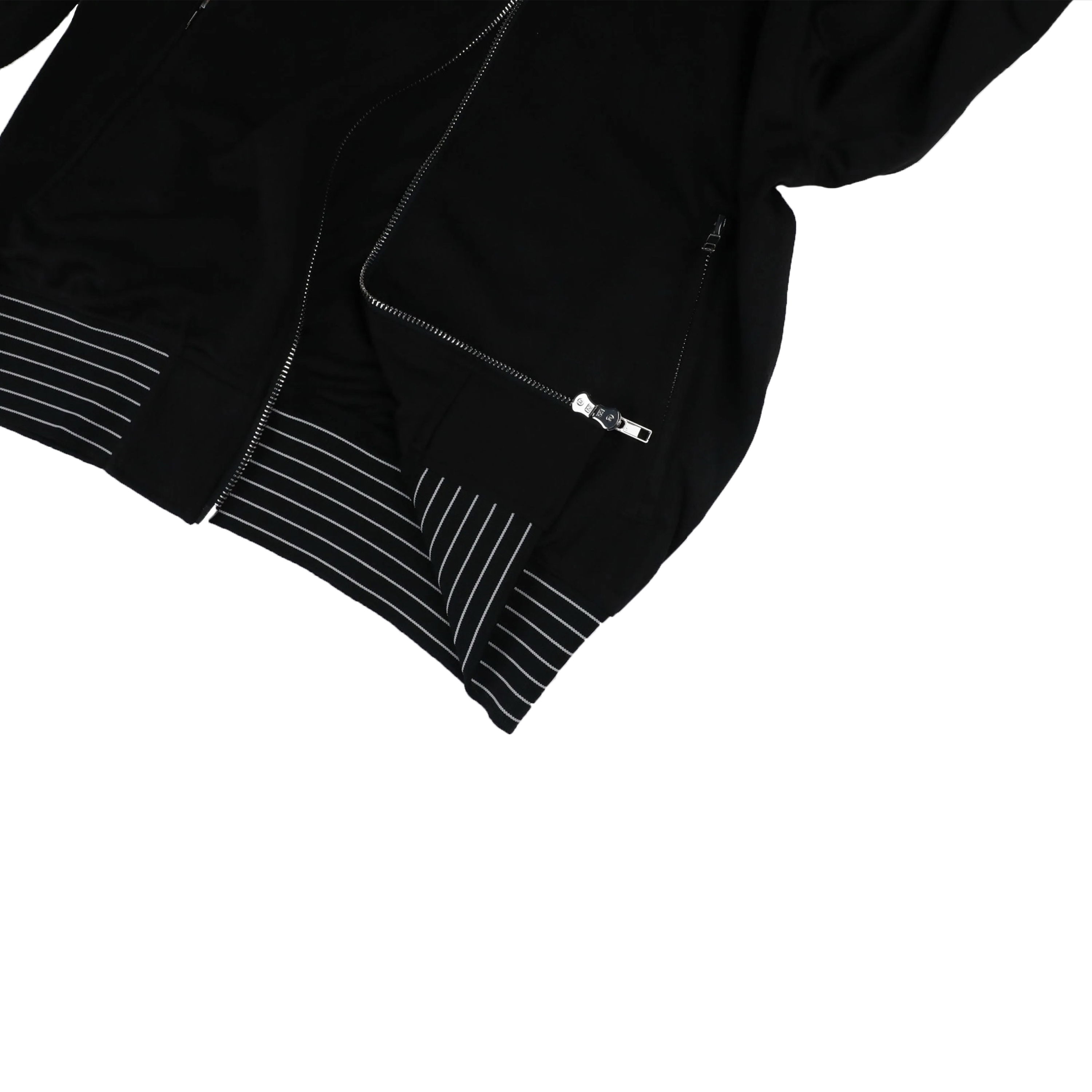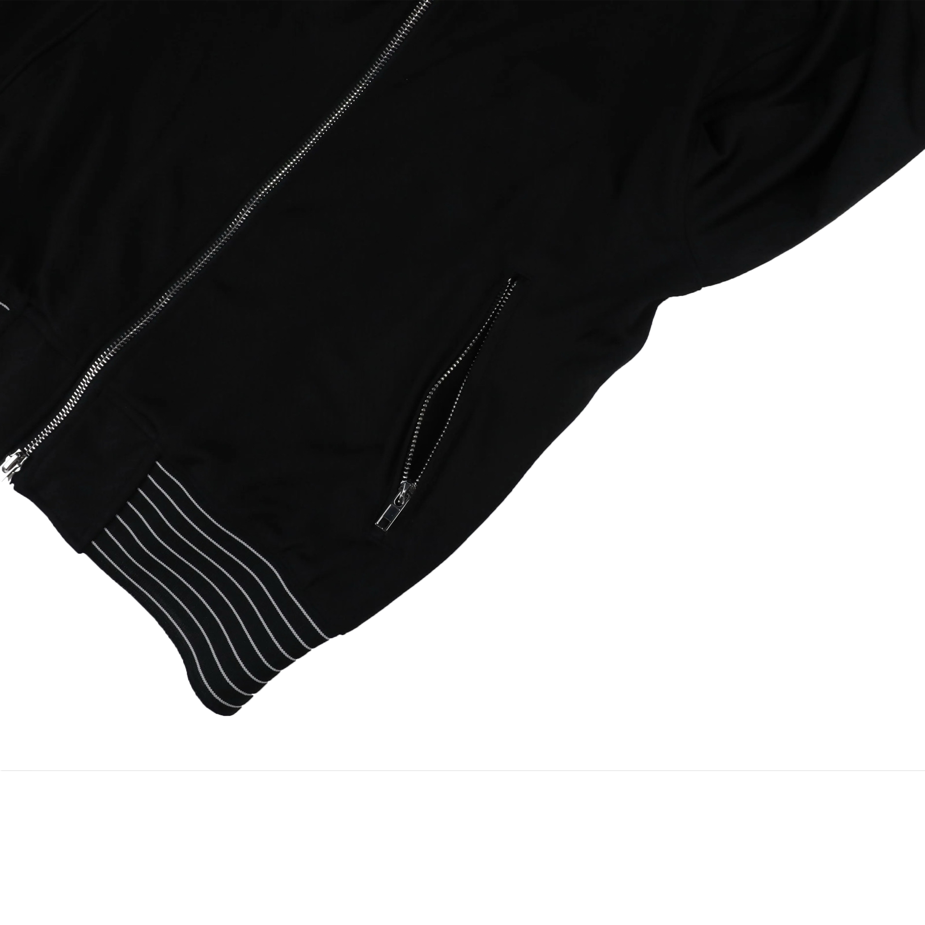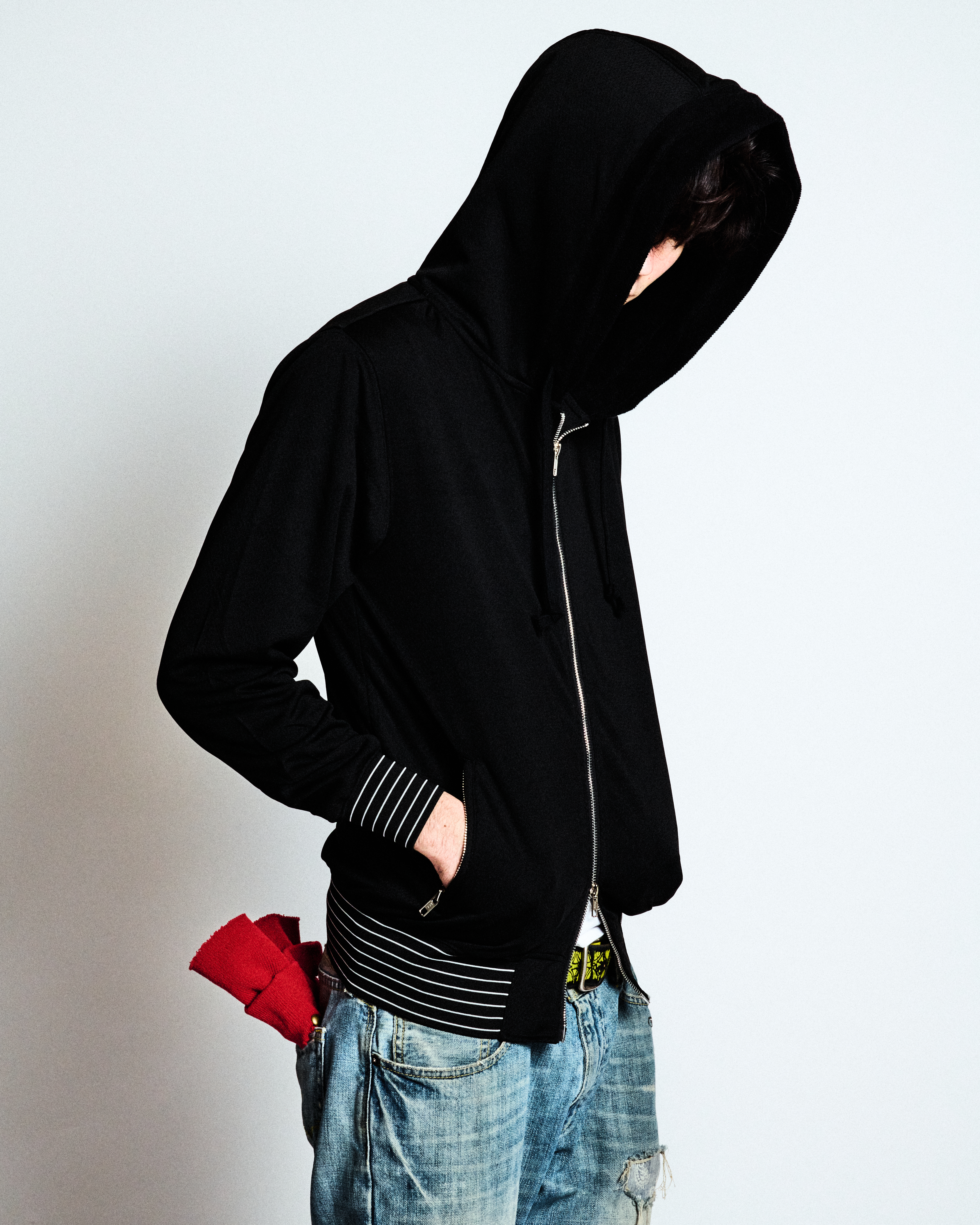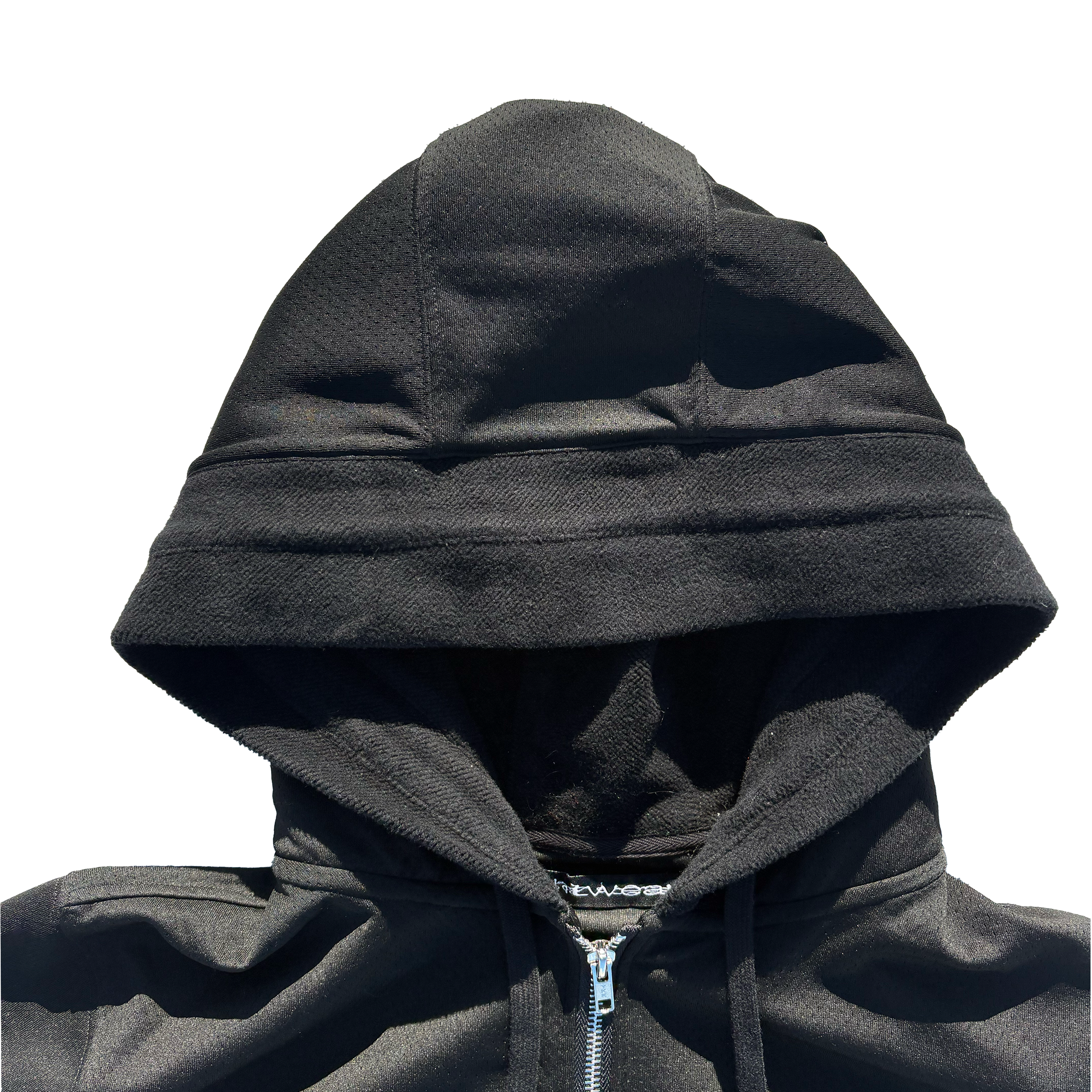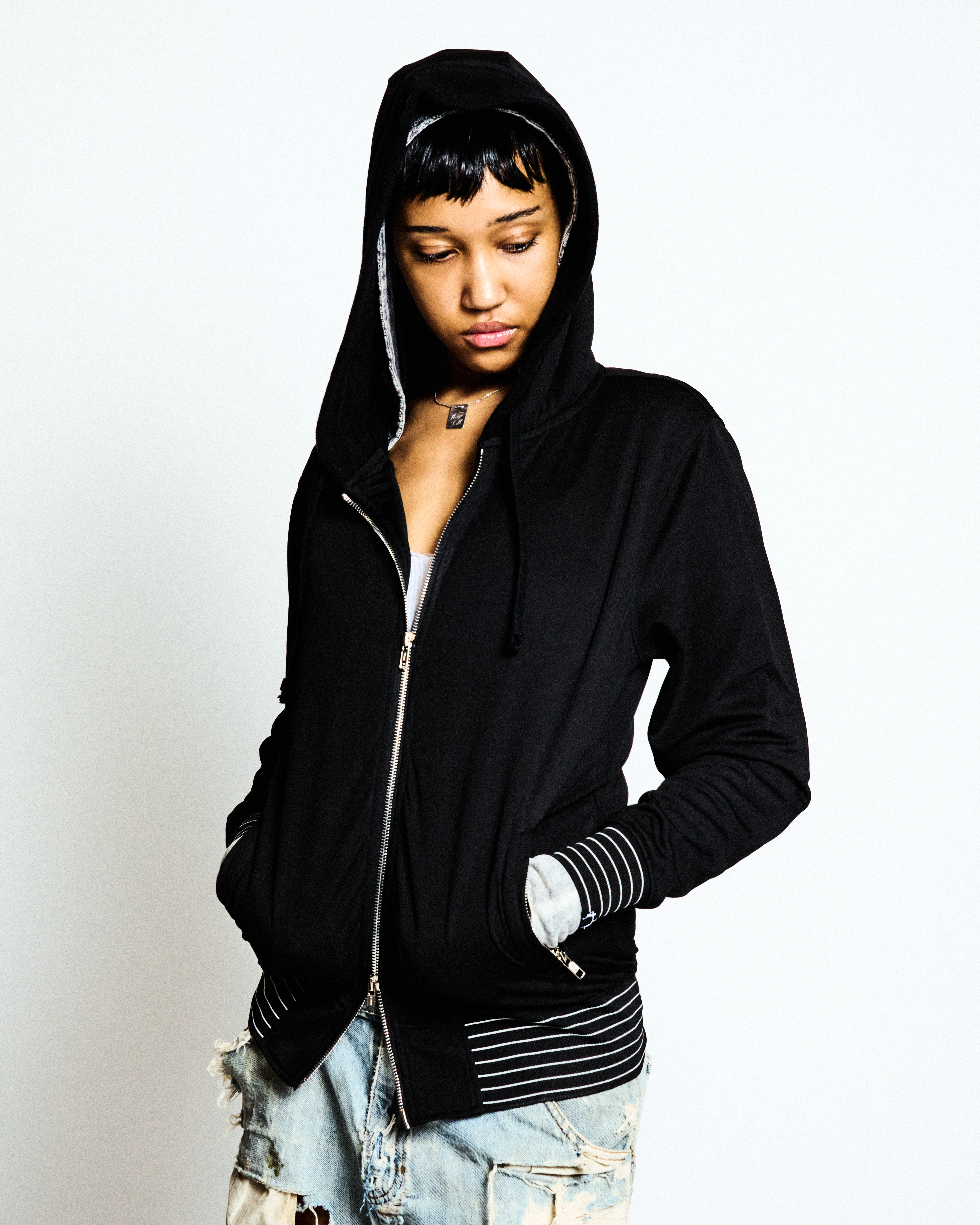 Eyelet mesh body. Center front double-zip closure with side zip pockets. Oversized hood with additional cotton ribbing.